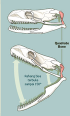 Ular dapat memangsa kurang lebih 1-10 kali lipat besar kepalanya. Hal tersebut dikarenakan ular memiliki struktur rahang yang berbentuk segi empat (quadrate bone), dan disambung oleh ligamen (otot) yang sangat elastis, sehingga mulutnya dapat membuka kurang lebih 150°.